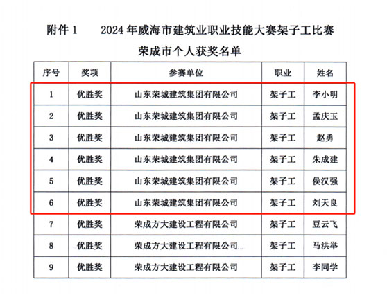 2024年6月21日,由威海市人力資源和社會(huì)保障局、威海市總工會(huì)、威海市住房和城鄉(xiāng)建設(shè)局主辦,威海市建筑工程服務(wù)中心、臨港區(qū)住房和城鄉(xiāng)建設(shè)局、威海市建筑業(yè)協(xié)會(huì)承辦的2024年度威海市建筑業(yè)架子工職業(yè)技能大賽在環(huán)翠區(qū)萬(wàn)禾書(shū)院項(xiàng)目部舉行。比賽現(xiàn)場(chǎng),23支隊(duì)伍的69名參賽選手穿著整齊的工作服,頭戴安全帽,身著工服,精神飽滿,動(dòng)作嫻熟,有條不紊的進(jìn)行一系列工藝操作,展示著扎實(shí)的專業(yè)功底和豐富的技能經(jīng)驗(yàn)。經(jīng)過(guò)數(shù)小時(shí)的激烈角逐,我司架子工代表李小明、孟慶玉、趙勇、朱成建、侯漢強(qiáng)、劉天良獲得優(yōu)勝獎(jiǎng),公司獲得團(tuán)體三等獎(jiǎng)的好成績(jī)。